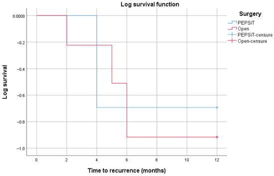 A log-rank (Mantel–Cox) test restricted to the first 12 months of follow-up did not show a statistically significant difference in recurrence-free survival between the PEPSiT and open surgery groups (χ2 = 0.006, p = 0.937) (Figure 7).