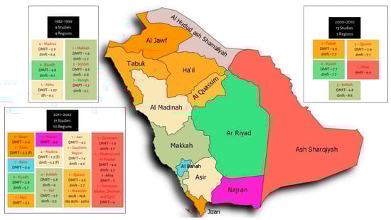 From 2011 to 2022, this variability persisted. Studies reported DMFT scores from 0.26 among 6–7-year-olds in Jeddah to 7.0 among 15–19-year-olds in Al-Ahsa and dmft scores ranging from 1.4 in 12-year-olds in Madina to a high value of 9.0 in 4–6-year-olds in Jeddah [18,19,20,21]. Figure 2 presents the distribution of reported caries values across Saudi regions from 1982 to 2022.