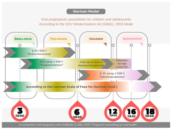 Germany and Saudi Arabia differ substantially in the legal foundations and organizational structures governing children’s oral health. Germany operates under a legally codified preventive framework defined in the Social Code Book V (SGB V) [42], which mandates nationwide group and individual prophylaxis programs with age-specific entitlements. These include supervised brushing, fluoride varnish, fissure sealants, and structured early-detection examinations beginning in infancy. These entitlements are chronologically aligned with the child’s oral development, as illustrated in Figure 3, which maps Germany’s preventive services across key age intervals and corresponding SGB V provisions.