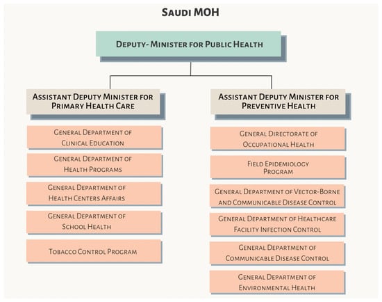 Saudi MOH primary health care and preventive health organization structure. Source: Saudi Ministry of Health website: https://www.moh.gov.sa/en/Ministry/About/Pages/Organizational-Structure.aspx (accessed on 5 February 2026).