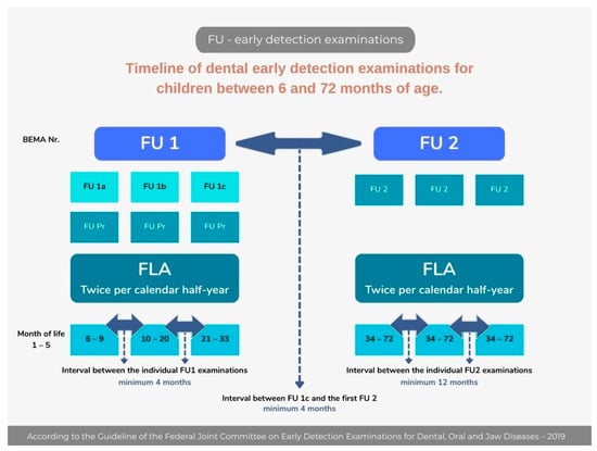 Timeline of early dental examinations for children between 6 and 72 months of age covered by statuary health insurance [43,44,45].