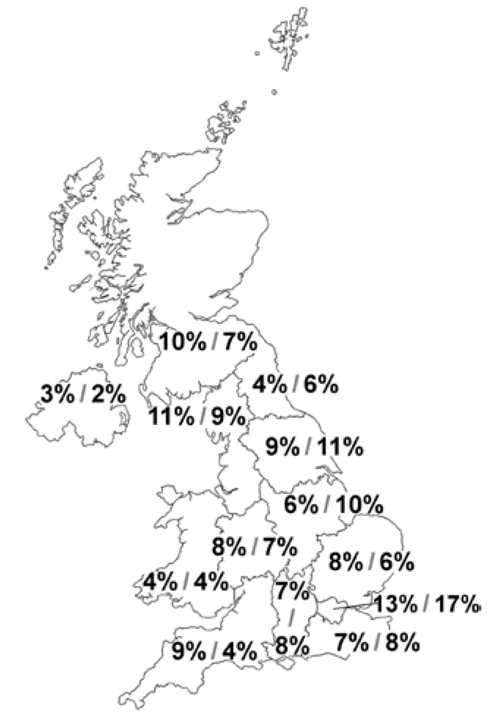 A total of 300 parents of infants diagnosed with CMPA completed the second survey questionnaire, of which 206 (68.7%) were mothers and 94 were fathers. Twenty per cent of the parents were aged between 18 and 24 years, with the majority (57%) between 25 and 34 years, and 24% were 35 years old and older. Twenty eight per cent had 1 child, 40% had 2 children and 31% 3 or more children. The parents’ distribution was from all areas of the UK (Figure 1).