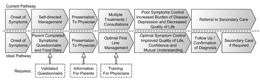 According to the survey on parents, it took on average of 10 weeks for the diagnosis to be made, whereas GPs estimated this to occur within 8weeks. It is however acknowledged that it should ideally occur within 4 weeks’ time. This finding is supported by a study from Sladcevicius et al. who showed that it took on average 9 weeks with numerous GP visits in the UK before a child was diagnosed correctly with CMPA [15]. Conversely, a similar study in the Netherlands found that the diagnosis of CMPA occurred there within 4 weeks [20]. This is an important finding that needs to be addressed, as Valentine et al. found that the combinations of the symptoms of CMPA with the delayed diagnosis in some cases may affect a family’s dynamic and quality of life [21]. In addition there are some studies on IgE-mediated food allergies that showed a significant impact on the parents’ life, possibly because of the combination of the child’s symptoms, extra-intestinal manifestations (for example poor sleep) [22], the difficulty of getting a quick diagnosis and correct treatment, and the burden and difficulty of following an elimination diet [23]. A delay in diagnosis may also lead to feeding difficulties due to on-going pain associated with feeding, leading to a negative association with the breast or bottle, and may also disrupt early weaning [24,25]. In 2011, Saps et al. found that CMPA in early infancy increases the risk of developing functional gastrointestinal disorders in later childhood, such as abdominal pain [26].