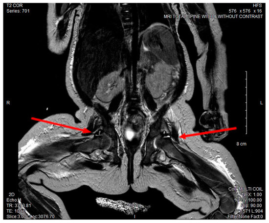 Hemarthroses are classically seen in patients with hemophilia A or B. They usually occur in peripheral joints and initially present in toddlers with inflammation, angiogenesis, and subsequent fibrosis [8,9]. Clinically, patients with hemarthroses usually have joint stiffness and pain; they rest with the joint in flexion, resist passive motion, and exhibit decreased active motion of the joint [9]. Unknown genetic predispositions and the possible formation of factor inhibitors from a concurrent infection may influence the location and severity of the hemarthrosis [9]. However, even in hemophilia, hemarthrosis of the hip, known as coxhemarthrosis, is a very uncommon location for joint involvement [10].
