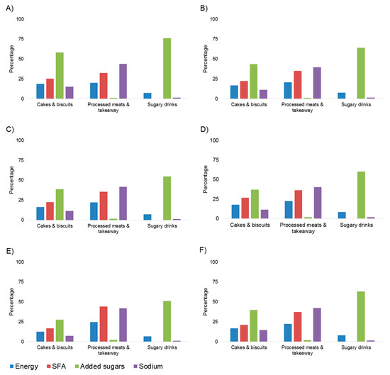 Target discretionary choice subgroups contribution to total percentage energy, SFA, added sugars and sodium, by age group of consumers. Values presented as an average percentage for each condensed subgroup: Cakes & biscuits: cakes, muffins and slices, sweet biscuits; Processed meats & takeaway: dishes containing processed meats, cereal-based takeaway foods; and, Sugary drinks: sugar-sweetened soft drinks, fruit drinks, cordials. (A) 2–3 year olds; (B) 4–8 year olds; (C) 9–13 year olds; (D) 14–16 year olds; (E) 17–18 year olds; (F) 2–18 year olds.