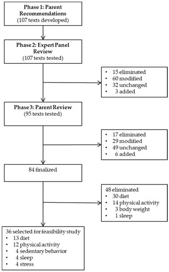 Parents suggested receiving at most 3 messages each week rather than daily text messages. Thus, 36 of the 84 text messages were selected for the study, distributed as follows: 13 diet, 12 physical activity, 4 sedentary behavior, 4 sleep, and 3 stress (Figure 1).