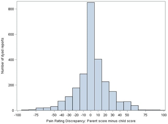 Discrepancy between child and parent ratings of child pain (parent score minus child score). Positive values indicate that the parent scored pain higher than the child. Negative numbers indicate that the child scored pain higher than the parent.