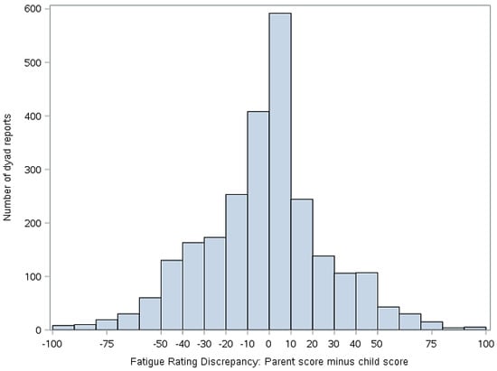 Discrepancy between child and parent rating of child fatigue (parent score minus child score). Positive values indicate that the parent scored the fatigue higher than the child. Negative numbers indicate that the child scored the fatigue higher than the parent.