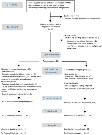 The study is a prospective RCT with a parallel waitlist design for the evaluation of a group cognitive behavioral program for children aged 6–12 years suffering from FAP (Current Controlled Trials registration ISRCTN 69830258). Figure 1 displays the RCT flow chart, which follows CONSORT guidelines. The complete CONSORT checklist is provided (Table S1) as an online supplementary document. Eligible families were recruited from an epidemiological study on the psychological well-being of primary school children over a 15-month period (recruitment: April 2008–July 2009). Eligibility criteria for further medical and psychological examination referred to the children, and were defined as the occurrence of chronic abdominal pain at least once a week and lack of organic findings which could account for the symptoms. The 144 eligible cases were invited for further examination to confirm self-reported questionnaire data. This included referring the child for a medical examination for the diagnosis of pediatric FAP and a psychological examination by a standardized diagnostic parent interview [] to eliminate the possibility that the child fulfills criteria for a psychiatric disorder, according to ICD-10. For pain symptomatology, Rome-III diagnosis of Functional Abdominal Pain Syndrome (FAPS) [] had to be fulfilled. Diagnosis of FAPS, according to Rome III, requires abdominal pain at least once per week for at least two months, along with associated impairment in everyday life or occurrence of other bodily complaints. A detailed description of the study design can be found in previous publications by the authors [,].