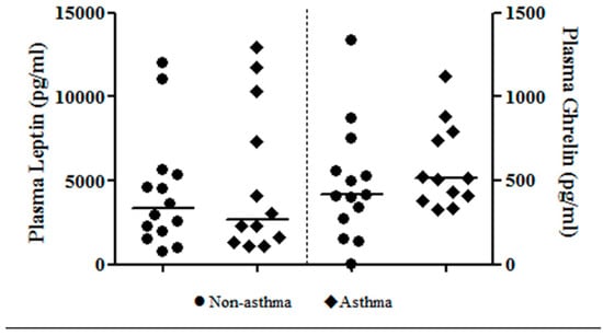 Blood was collected in a subset of 13 asthmatic and 14 non-asthmatic children. Plasma triglycerides were significantly higher in the asthmatic group versus the non-asthmatic group (Table 3), while the HOMA-IR value and hsCRP were similar between groups. Morning plasma ghrelin (p = 0.328) and leptin (p = 0.959) levels were also similar between groups (Figure 1).