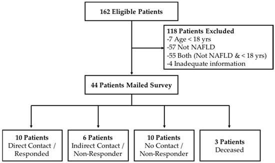 Patient contact information (mailing address, phone number, and email) was obtained using the LexisNexis search engine. All eligible subjects were mailed a cover letter introducing the study and eligibility, the survey, an informed consent information sheet, and a gift card. One to two weeks following the initial mailing, each patient was contacted by telephone by the study team to document verbal consent, obtain responses to the brief survey, and confirm their mailing address to send compensation and resources on NAFLD treatment (if interest was indicated). Compensation was provided in phases: first, five dollars was mailed with the initial cover letter to incentivize response, and an additional twenty dollars was mailed after completion of the brief survey. Each participant was called at most three times on different days and times, and voicemails were left, if possible. Electronic mail was also sent to each participant if the phone calls were unsuccessful. After all measures were taken, subjects were classified as responder, deceased, non-responder with no verbal contact (the study team could not reach the patient or his/her family), or non-responder with verbal contact (the study team spoke with the patient’s family, but not the patient).