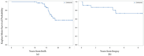 Kaplan-Meier survival curves for time to diabetes diagnosis. (a) Time to event starting from birth for the full sample of subjects; (b) Time to event starting at liver biopsy, excluding n = 12 subjects who were censored at time of biopsy.