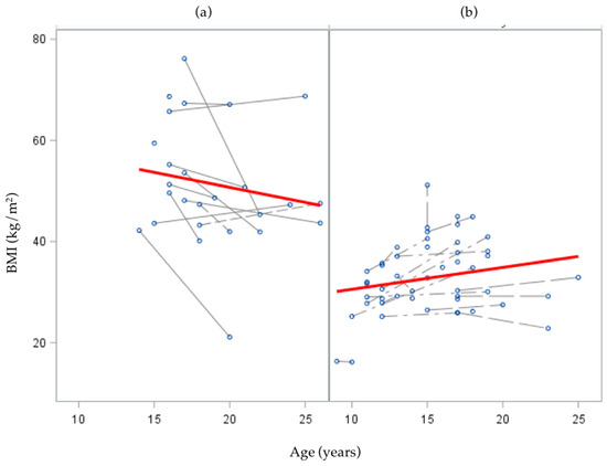 Longitudinal linear mixed-effects models with unstructured covariance structure were used to assess change in BMI from baseline to last follow-up, as these models allow for random variation within and between subjects, while also accounting for measurements at irregular time points of observation. The model was fit with “subject” as a random effect, “age” (in years) as a random and fixed effect, and a random intercept and slope. Parameter values were calculated using maximum likelihood estimation. An interaction model with “age × subgroup”, and their main effects, was also fit to assess heterogeneity in BMI trends by subgroup, as we hypothesized that weight loss surgery may have impacted BMI at baseline and change over time. Finally, logistic regression models tested if age, follow-up time, and/or gender were associated with odds of responding to the survey. SAS Statistical Software version 9.4 (SAS Institute, Cary, NC, USA) was used for the analysis. An alpha-level of 0.05 was established.