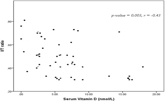 Neonatal 25-OH vitamin D serum levels were positively correlated with maternal 25-OH vitamin D levels and negatively correlated I/T ratio (r = −0.43, p = 0.003) (Figure 1), interleukin-6 (IL-6) and CRP (r = –0.75, p < 0.001) (Figure 2).
