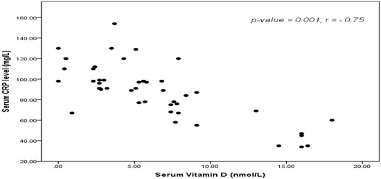Correlation between 25-OH vitamin D serum level and C-reactive protein (CRP) levels.