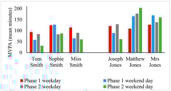 Mean weekday and weekend-day moderate-to-vigorous physical activity (MVPA) family comparisons for each participant and phase.