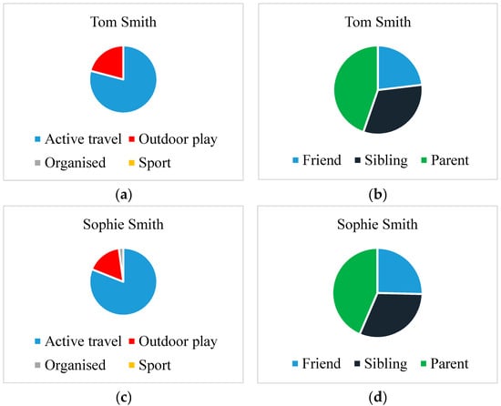 Figure 1 presents the median weekday and weekend-day MVPA levels for each participant by data collection phase, and Figure 2 presents the overall PA diary data for the child participants. There was a combined total of 117 recorded entries for Tom (n = 31), Sophie (n = 34), Joseph (n = 21), and Matthew (n = 31). Tom’s and Sophie’s PAs involved active travel and outdoor play, and were mostly undertaken with friends (Figure 1a–d). Their active-travel levels were consistent across phases, but their outdoor play levels were higher in phase 1 than in phase 2 (see supplementary file S1). Joseph and Matthew reported no participation in active travel and only some parent–child PA (Figure 2a–d). This parent–child activity took place on weekend days. Most of their PA took place with friends at sports club settings, especially on weekdays (see supplementary file S1).