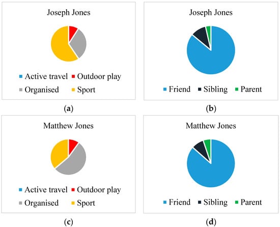 However, the Jones family reported limited parent–child PA. In contrast, the Jones children undertook most of their PA with friends at sport clubs (Figure 3b,d), whereas their parents’ PA was mainly undertaken at the health club. Interestingly, the Jones children reported spending time with their parents, but this was in the context of travelling to and from structured activities, rather than engaging in PA with their parents.