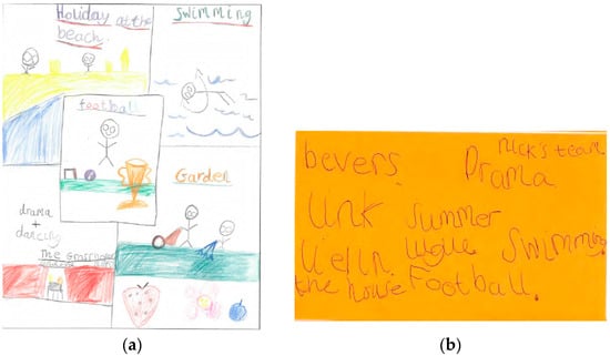 (a,b) Write, draw, show and tell (WDST) data for Matthew Jones, illustrating leisure activities. “Well, holiday. When I went to Malaga in Spain. When I went to Mummy's cousin's. Making sandcastles and jumping on the waves. I enjoy swimming. And this is me in the garden. Daddy's doing the wall, and I'm doing where you cut the grass at the side. And this one here is me playing football for my team. And drama and dance. We've just done a show. I was Adam Ant” [Matthew Jones].