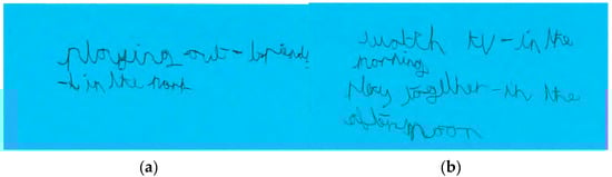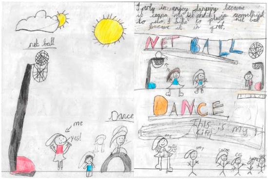 In contrast, the Smith children walked to and from school on weekdays and played outdoors after school in the neighbourhood with their school friends. Their MVPA levels were lower on weekend days compared to weekdays. The decline in MVPA between weekdays and weekend days was greater for Tom than Sophie (Figure 1). Sophie reported participating in more structured after-school activities (e.g., netball and dance) than Tom on weekdays, and spent more time with her mother actively commuting on weekend days. These activities were depicted in her drawing (Figure 5). This was contrary to her brother who spent most of his weekend time indoors playing video games and watching TV (Figure 6a,b).