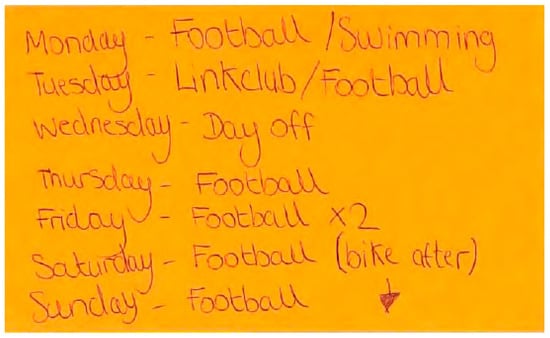 Another interesting finding was that the Jones children’s high enrolment in structured activities influenced their parents’ PA levels. At the time of the focus group, Joseph was attending football training sessions most days of the week (Figure 7), which impacted on the frequency with which his mother was able to visit the gym.