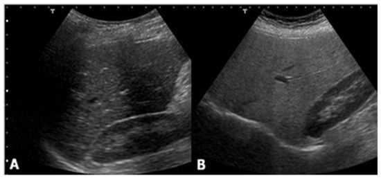 Ultrasound shows no difference between (A) the liver and right kidney cortex echogenicity, while (B) it demonstrates a hyperechoic liver compared with the kidney parenchyma.