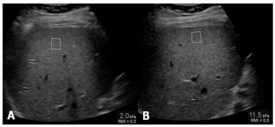 (A) Measurement of liver stiffness shows an estimated Young’s modulus of 2.0 kPa, below the cut-off for the diagnosis of stage F1 fibrosis; (B) Measurement of liver stiffness shows an estimated Young’s modulus of 11.5 kPa which reveals the presence of fibrosis.
