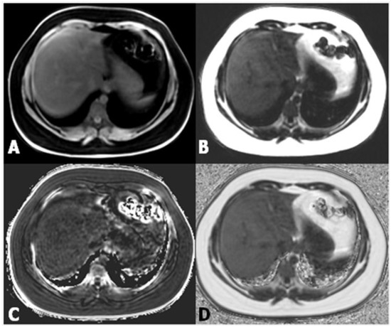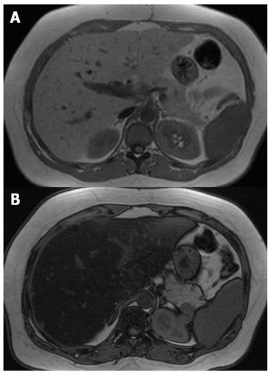 Different methods can be performed for the evaluation of liver steatosis by magnetic resonance imaging (MRI), but the most widely preferred method is based on chemical shift imaging [14,15]. This technique is based on the different precession of protons linked to water and triglyceride molecules. Two sets of gradient-echo images of the liver are obtained, and echo-time-dependent signal interference between fat and water is considered. On in-phase echo-time, water and fat signals add up and therefore, the total signal intensity is higher. On out-of-phase echo-time, water and fat signals cancel out each other and consequently the total signal intensity decreases. Healthy liver has no difference in signal intensities between the in-phase and out-of-phase images, however, in the case of fat storage, the liver signal intensity diminishes on the out-of-phase image (Figure 3). This imaging method is reliable in the absence of magnetic field non-homogeneity and iron deposition. The main drawback is that the quantity of water and fat can affect their signals. This can be managed by acquiring new images with variable T1-weighting, through the application of two flip angles. High-flip-angle imaging is desirable for uncovering small amounts of fat in tissues that include mainly water, while low-flip-angle imaging should be applied for revealing small amounts of water in fat-rich tissues [16].