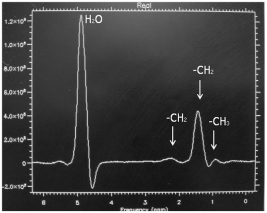 MRS is considered the non-invasive reference standard in the assessment of liver steatosis, because it is able to measure the real concentration of triglyceride within the hepatocytes in a specific volume, by analyzing protons of water and acyl-groups of the triglyceride differences in a specific resonance frequency domain [26,27,28,29]. The lipid (triglycerides) spectrum consists of multiple peaks that are identified at 0.9, 1.3, 2.0, 2.2, and 5.3 ppm, and whether the water peak is localized at 4.3 ppm. The dominant lipid peaks are caused by the resonance of methyl (–CH3) protons and methylene (–CH2–) in the triglyceride molecule (Figure 5) [30]. In normal cases, the dominant water peak is clear, and no triglyceride peaks are present. Existence of liver fat permits evaluation of a hepatic fat fraction via the area-under-water peak versus the area-under-fat peaks [31]. MRS has reported good correlation with histology for the evaluation of liver steatosis in children [32]. In the author’s experience, the ρ value has been measured at 0.68 and the sensitivity and specificity in the differentiation between healthy children from those with NAFLD, were 92.6 and 95.7, respectively [33].