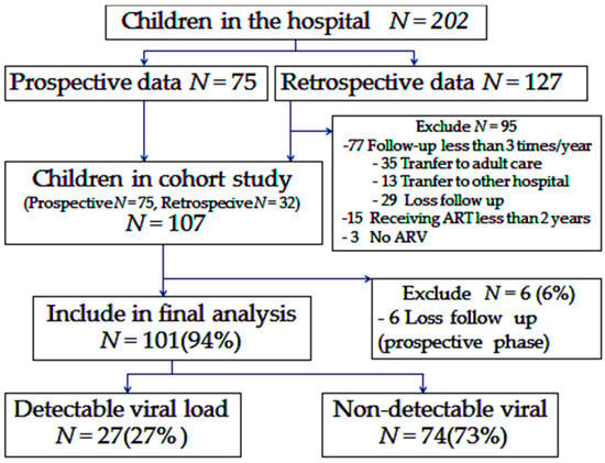 A total of 107 HIV-infected children were enrolled. Six children were excluded from the final analysis due to loss to follow-up. Thus, of the 107 children enrolled, 101 were included in the final analysis. Of these 101 children, 27 (27%) were classified as dVL, while 74 (73%) were non-dVL children (Figure 1).