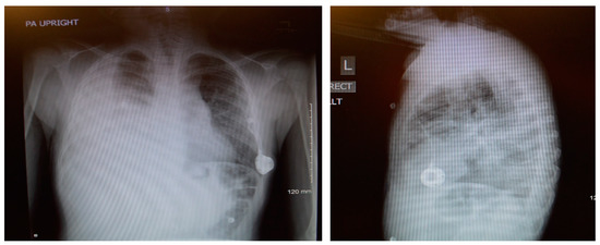 Post-operative chest X-rays, showing reversed pleuroperitoneal shunt in right chest and abdomen.