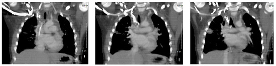 Chest computed tomography (CT) (intravenous (IV) contrast) scan demonstrating inability to fully visualize the superior vena cava (SVC) in total, and no opacification of the right internal jugular (IJ). Images from left to right demonstrate CT slices in an anterior to posterior fashion, respectively.