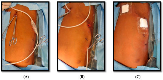 Operative photos of the insertion of the reversed pleuroperitoneal shunt. Right abdomen and chest shown; head is at top. From left to right: (A) shunt tubing laid over body, with instruments accessing right chest via axilla, and abdomen via umbilicus; (B) shunt tunneled under skin; and (C) final result with bandages.