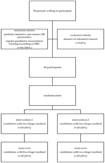 A flow diagram can be found in Figure 2. There were 20 pediatric intensive care nurses and 20 paramedics that participated in the study. Of the participants, 25 (62.5%) were female, with an overall mean shoe size of 40.0 ± 2.7 Paris points and a median hand size of 17.5 (17–18.5) cm. A total of 5401 inflations were analysed, including 2796 inflations with two fingers and 2605 inflations with five fingers. All of the participants completed the entire protocol.