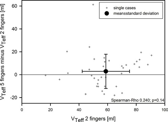 The VTdel was significantly lower during the two-finger technique compared with the five-finger technique (87.7 ± 15.5 vs. 96.1 ± 19.4 mL, respectively; p < 0.01; as seen in Table 1). The mask leak was also significantly reduced for the two-finger technique (27.9 ± 22.4 vs. 34.4 ± 24.5 mL; p = 0.02). As a result, the VTeff did not differ significantly between the two-finger and five-finger techniques (58.8 ± 16.6 vs. 61.7 ± 23.9 mL, respectively; p = 0.35; Table 1). VTeff was similar in the pediatric intensive care nurses and paramedics. The difference between two- and five-finger techniques tended to be more pronounced at higher tidal volumes, but this correlation was not significant (Spearman’s ρ 0.24; p = 0.14; Figure 3).