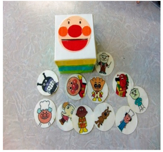 Figure 1: This handmade toy is a saving box shaped like Anpanman for children to enjoy touching original coins with various Anpanman characters drawn on and dropping them into the saving box. The coins with visually enjoyable drawings are also usable as cards.
