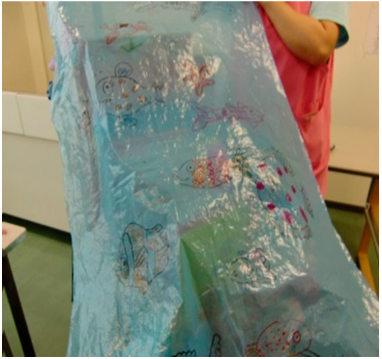 Figure 3: Fishes of the sea are drawn on a blue plastic sheet. It is also possible to paste fish drawings onto the sheet, or use the sheet for fishing games. With the sheet spread on the bed, children lying in bed can also enjoy the world of the sea.