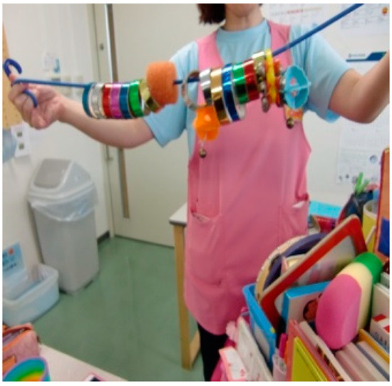 Figure 4: This toy consists of a cord, hooks, and various materials with holes, such as rings made from glittering tapes of different colors and bells, threaded onto the cord. For children in bed, the cord is hooked at the bedrail, and rings are slid toward the opposite side at a signal from HPS, such as “Here they go! Choo!”, so that they enjoy the movements and sounds of rings that move while rotating and changes of color.