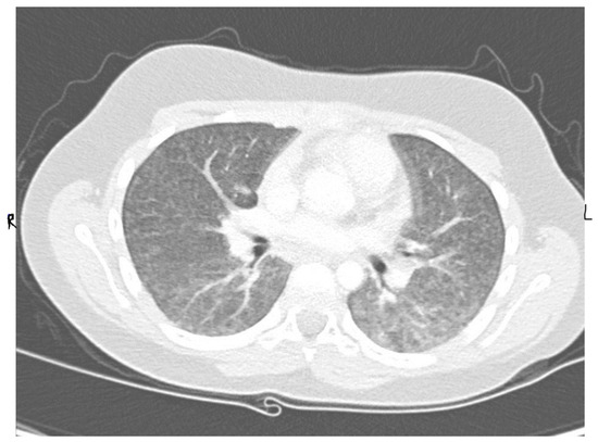 The pathophysiology of HP is complex and not well understood. Numerous organic and inorganic antigens can cause immune dysregulation, leading to an immune-related antigen–antibody response (IgG against the offending antigen) [2,3,4]. Others have suggested underlying genetic factors that may contribute to the development of BFL [1]. Pathologically, finding of lymphocytic plasma cell infiltration and foamy macrophages were found in our patient’s histopathological lung biopsy, which are distinguishable parenchymal changes that occur during the acute/subacute phase of an illness. No definitive granulomas were seen (Figure 3a,b) [4].