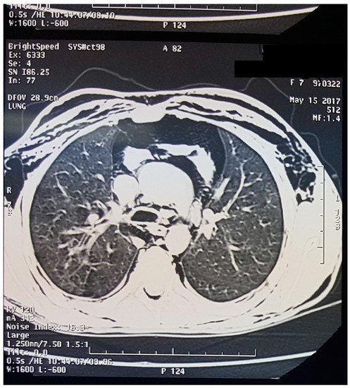 Laboratory tests: arterial blood gas: pH: 7.46, paO2 95 mmHg, paCO2 35 mmHg, bicarbonate 24.2 mmol/L. Biochemistry: C reactive protein 14 mg/L; normal renal function tests and electrolyte levels. Hematology: hemoglobin 11.5 g/dL; white blood cell count 12.7 × 109 cells/L; platelet count 245 × 109 cells/L. The bronchoscopy, which was performed one day later, was normal.