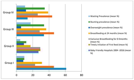 | Country by Group | Baby Friendly Hospitals 2004–2016 (%) | Timely Initiation of First Feed (%) | Exclusive Breastfeeding for 6 Months (%) | Continued Breastfeeding for 24 Months (%) | Overweight Prevalence (%) | Stunting Prevalence (%) | Wasting Prevalence (%) | |