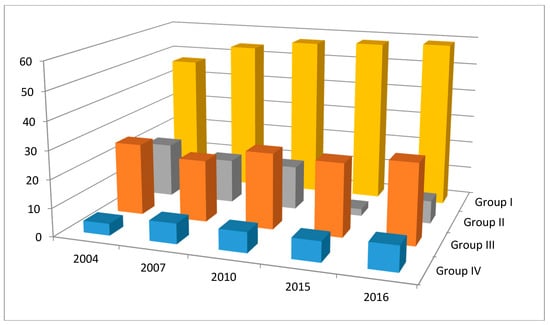 | Country by Group | 2004 (%) | 2007 (%) | 2010 (%) | 2015 (%) | 2016 (%) |