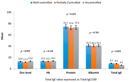 Laboratory characteristics among asthmatic children in relation to asthma control. IgE: Immunoglobulin E; Hb: hemoglobin, p—p-value.