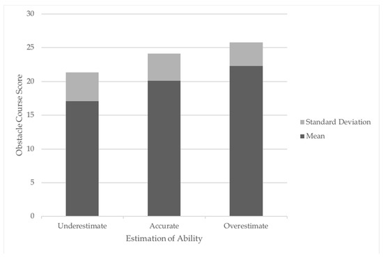 A one-way analysis of variance (ANOVA) was then performed to determine if there was a significant difference between accurate, under and over perception groups in CAMSA performance. Since a significant difference (p = 0.000) was found, a Tukey post-hoc test was performed to determine where the difference existed. This post-hoc analysis indicated significant differences between participants that underestimated and accurately estimated (p = 0.15) their abilities as well as between those who overestimated and accurately estimated their abilities (p = 0.000). More specifically, participants that accurately estimated their abilities had, on average significantly lower CAMSA scores (20.1 ± 4.03) than children that overestimated (22.3 ± 3.47) their abilities and significantly higher scores than children who underestimated their abilities (17.1 ± 4.27). (See Figure 1).