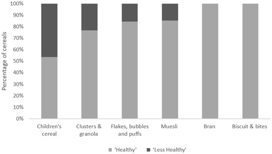 Percentage of Australian breakfast cereals classified as “healthy” and “less healthy”. Nutrient profiling scores were calculated using the formula provided by Food Standards Australia New Zealand (Standard 1.2.7) for “children’s cereals” (n = 28), “clusters and granola” (n = 56), “flakes, bubbles, and puffs” (n = 103), “muesli” (n = 109), “bran” (n = 7) and “biscuits and bites” (n = 18). Products were classified as “healthy” if they received a NPS less than four, whilst products with a NPS score greater or equal to four were deemed “less healthy”.