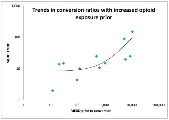 Routes of administration included enteral (n = 8), sublingual (n = 2), intravenous (n = 4) and subcutaneous (n = 2). Twelve children were rapidly converted from a prior opioid to methadone and conversion ratios from equivalent daily oral morphine equivalent ranged from 2:1 to 150:1. Half of the conversions to methadone were in the range 10:1 to 20:1, two received less than 10:1, and four received greater than 20:1. The lowest conversion ratio of 150:1 correlates with the highest equivalent prior MEDD (10,800 mg) of the patients analysed. This patient subsequently needed incremental dosing up to 600 mg daily of infused subcutaneous methadone, representing a conversion of 13:1 from the original morphine equivalent, in the context of end-of-life care. A graph of conversion ratio to MEDD prior to conversion is provided with an average line on a logarithmic scale (Figure 1), demonstrating an expected increase in ratio used with increased previous opioid exposure.