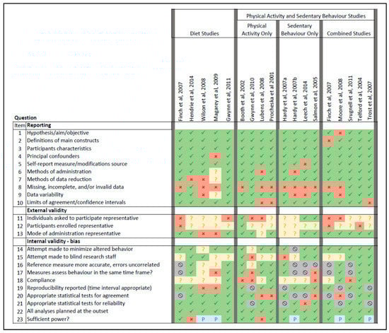 The reporting of studies was generally adequate, however many studies did not describe the characteristics of participants with missing, incomplete, and/or invalid data. The external validity of both diet and physical activity studies in terms of the representativeness of those invited to participate and those participating was often not able to be determined or was not adequate. However, the mode of administration of instruments was usually representative of similar study designs. Some aspects of internal validity such as attempts to minimise altered behaviour, appropriate statistics to test reliability (where applicable), planning of analyses, and having sufficient power were adequate across the studies.