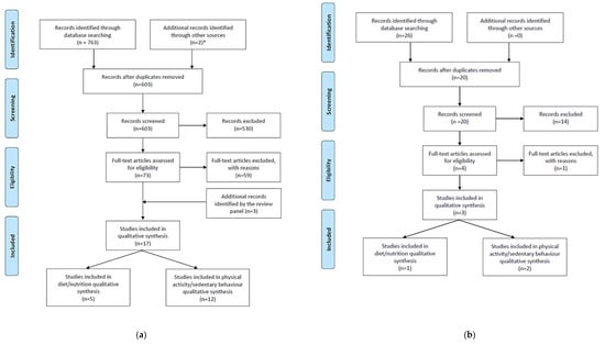 Flow of information through the different phases of the rapid review for identification of (a) studies on diet and physical activity/sedentary behaviour, and (b) studies on diet and physical activity/sedentary behaviour that specifically relate to Aboriginal and Torres Strait Islander children. The PRISMA (Preferred Reporting Items for Systematic Reviews and Meta-Analyses) diagrams are modified from Moher et al. [64]. * [62,63].