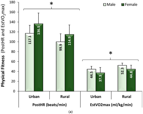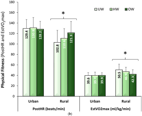 (a) Physical fitness levels for male and female adolescents by location, which illustrates that females had consistently lower fitness levels than males, regardless of location; (b) Physical fitness levels for underweight (UW), healthy weight (HW), and overweight/obese (OW) adolescents by location, which illustrates that physical fitness levels were significantly higher in UW and HW adolescents compared to OW adolescents only in the rural (southern) Sierra region with no difference in physical fitness across weight status in the urban (northern) Sierra region (Means ± SD). * adjusted p < 0.0001. PostHR: immediate post-exercise heart rate; EstVO2max: estimated maximal oxygen consumption.