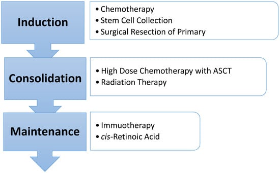 Current therapy in most institutions in North America is broken into three phases—induction, consolidation, and post-consolidation or maintenance therapy (Figure 1). Treatment includes chemotherapy, surgical resection, high-dose chemotherapy with autologous stem cell rescue, radiation therapy, immunotherapy, and isotretinoin. The current treatment lasts approximately 18 months.